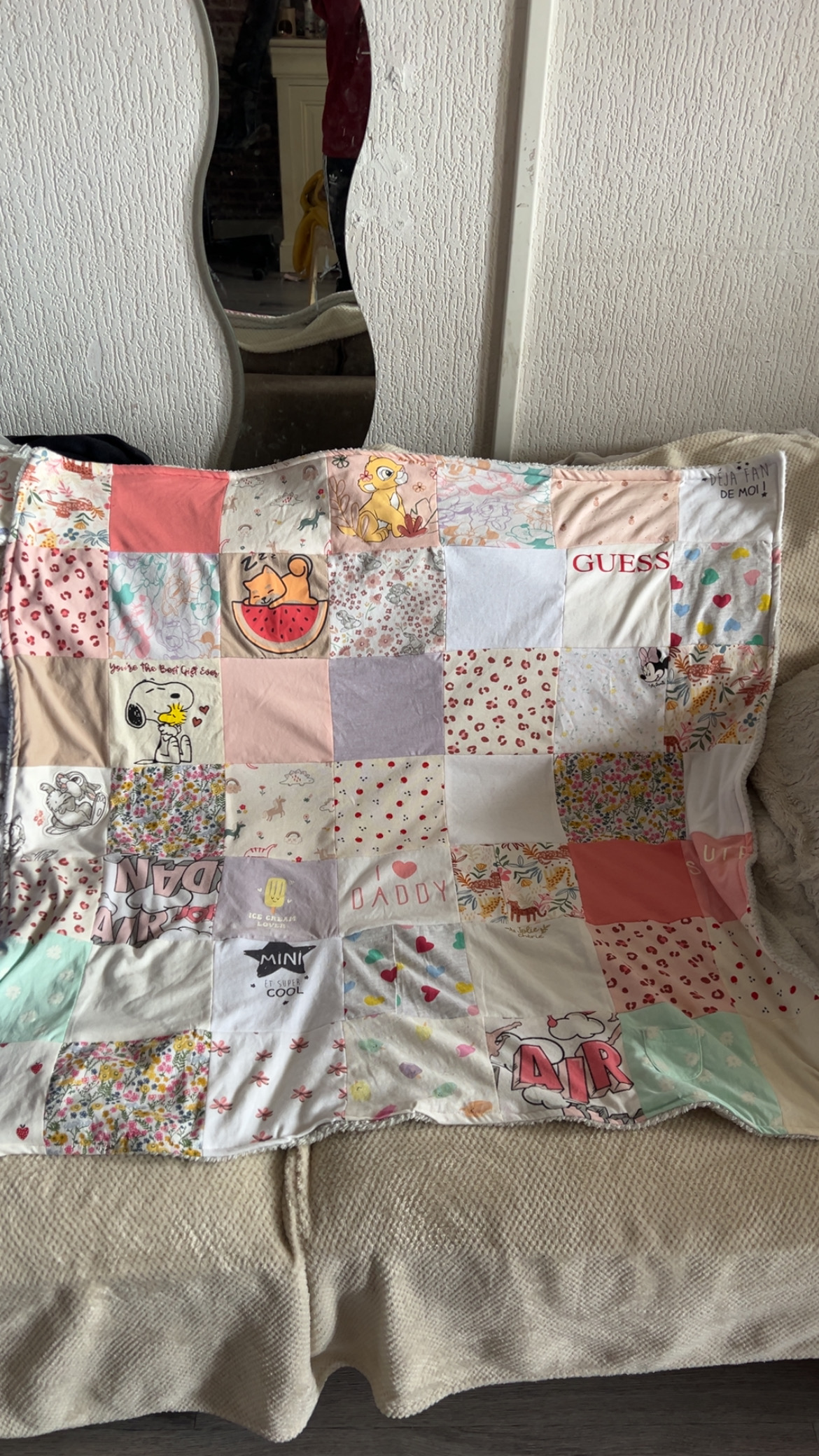 j’utilise vos vieux vêtements pour la face avant pour l’arrière j’utilise du polaire minky